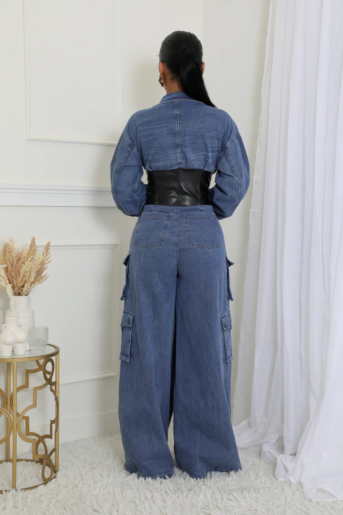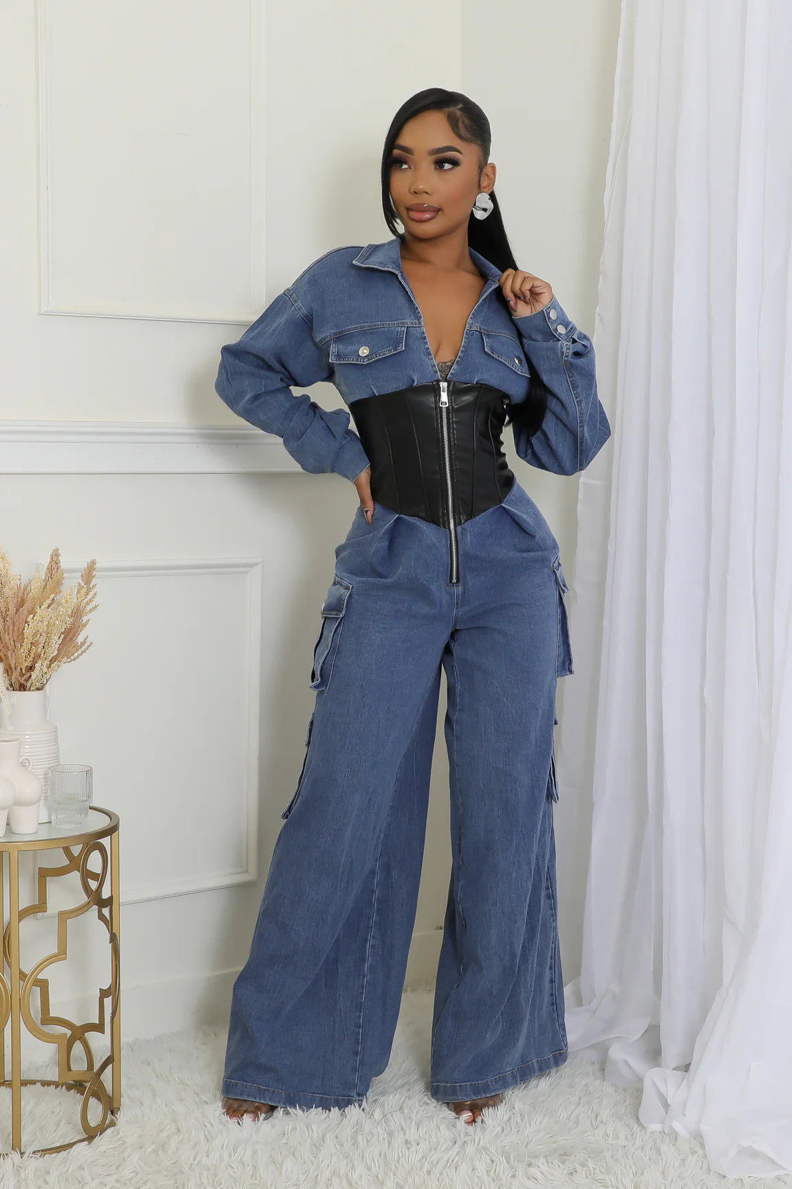 Non-stretch denim jumpsuit. Elastic waistband. Pockets. Zipper closure. Inseam is 32 inches. 95% Cotton. 5% Spandex